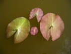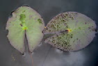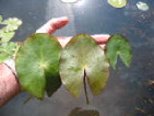 Die Schwimmblätter zeigen keine Marmorierung! Die Blattspreite ist weit geöffnet. Der junge Blattaustrieb ist rötlich, das ältere Schwimmblatt ist grün. Die Blattunterseite zeigt eine starke rötliche Färbung. |