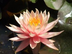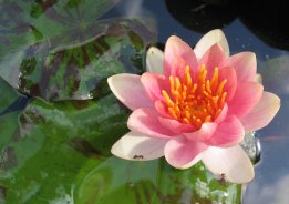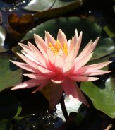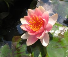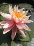 N. 'Sunny Pink' ist vermutlich aus einer Kreuzung mit der gelben Seerosensorte 'Texas Dawn' entstanden. 'Sunny Pink' ist durch ihre vielen guten Eigenschaften bemerkenswert und wurde in Deutschland zur Seerose des Jahres 2007 ausgezeichnet. In 40-50 cm Wassertiefe bilden sich ca. 14 cm große sternförmige Blüten im Farbton pfirsich. Die Schwimmblätter erreichen ca. 22 cm Durchmesser. Auch die Winterhärte ist kein Problem. |